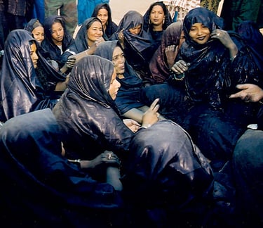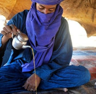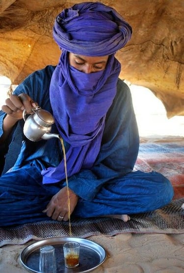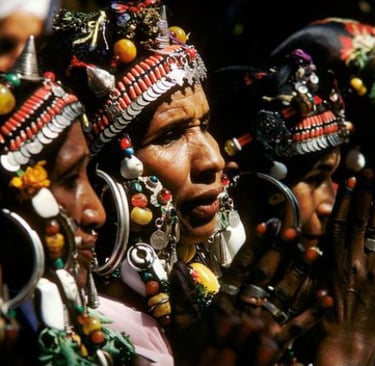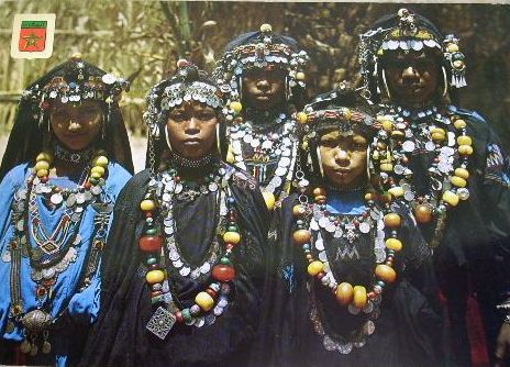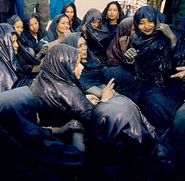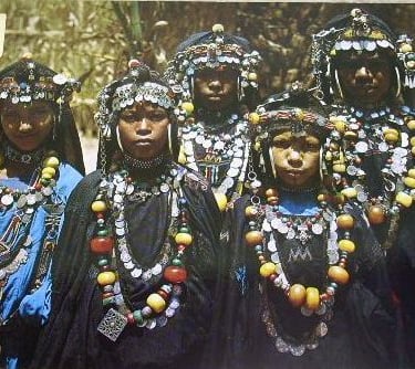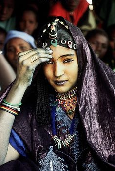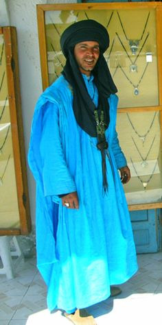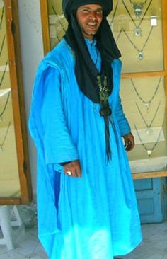 They have been called the "blue people" for the indigo-dye colored clothes they traditionally create & wear and which stains their skin. A semi-nomadic Muslim people, they are believed to be descendants of the Berber of North Africa. They are known for wearing the daraa, a long, loose gown, and the tagelmust, a cloth veil that is used as a turban and are excellent silversmiths and musicians.