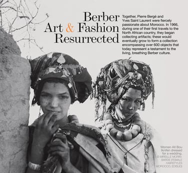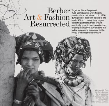 There was a large movement in the 60-70's of European artist that were influenced by the Berber. This would peak around 1966-68 when Pierre Berger traveled through the North African area collecting photos and artifacts of Berber women for Yves St Laurent Fashion. During the decades they spent holidaying in Morocco, Yves Saint Laurent and Pierre Bergé became captivated by the culture of the native Berber, or Amazigh, tribe, which has inhabited North Africa for 9,000 years. The extensive collection of Berber art and artifacts the couple acquired from the ’60s until Saint Laurent’s death in 2008 is now housed at the Musée Berbère at the duo’s Jardin Majorelle studio villa in Marrakesh.
