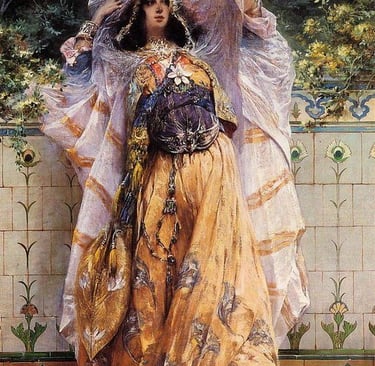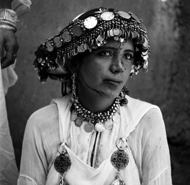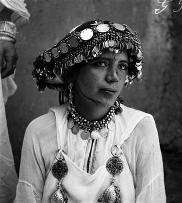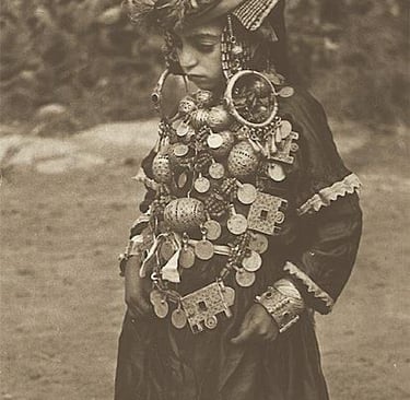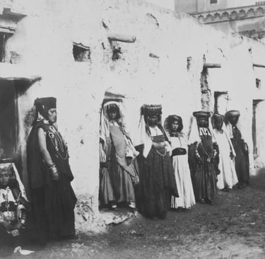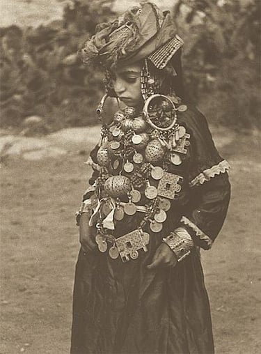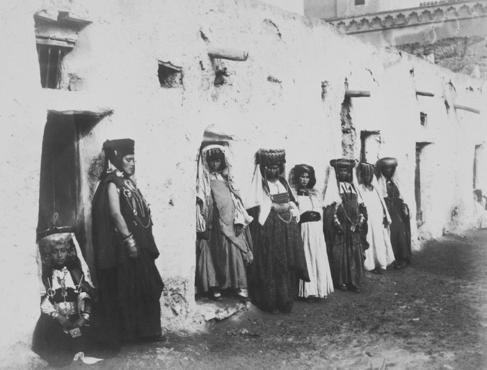 Below, Muslim girls waiting in streets of Ouled Nail, Algeria to earn dowry as dancers - a centuries old tradition. Algerian patrons would invite them at cafés, festivals or to shrines of Muslim awliya. When their dowries were adequate they returned to their mountain villages and would marry within the tribe This tradition has continued through modern history of Algeria.