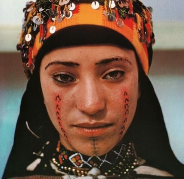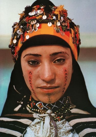 Many of the embroidery patterns are also protection symbols and language, I am sure each family has developed their own style/flourish to these symbols. The remarkably beautiful women are adorned with many protective facial tattoos carrying importance with them before they move to a new family when being wed. This was possibly the most major event in a Berber women's life. Sometimes close to home and other times quite far away.
