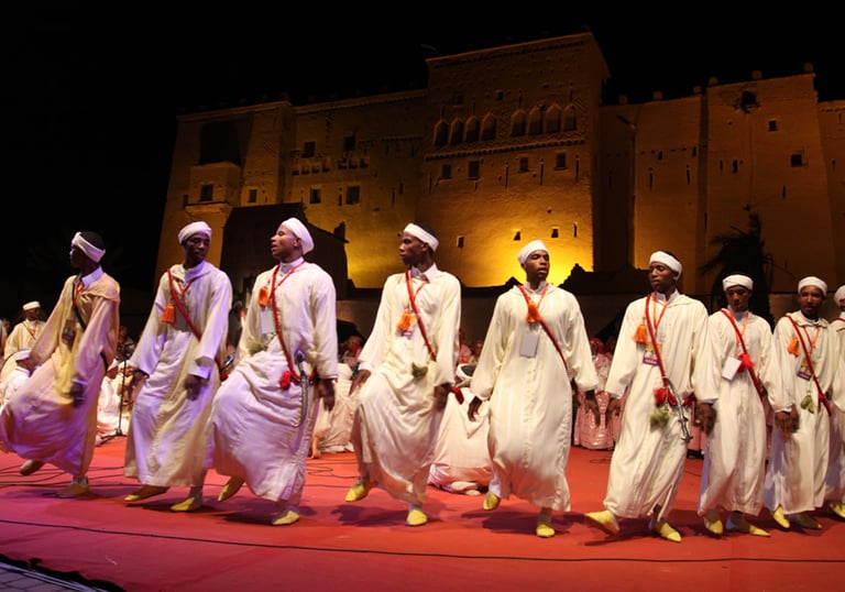 5. AHWASH: Performed in the High Atlas Mountains and particularly in the Ouarzazate area, the ahwash dance takes place around a fire. The male participants sit in a circle playing wooden bendir frame drums, while the women stand motionless in a larger circle. As the rhythm of the drums increase the women start swaying with the beat