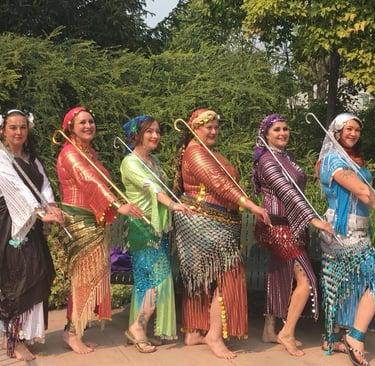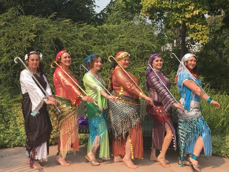 Ruby Star Bellydance Troupe wearing Beledi Dresses performing Raqs Assaya
