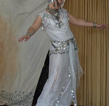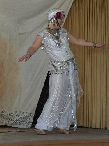 Taqsim –melody without percussion, played originally on oud, more recently on accordion, sax or keyboard. The dancer dances on the spot with small and contained movements. Usually the dancer sways to long notes.